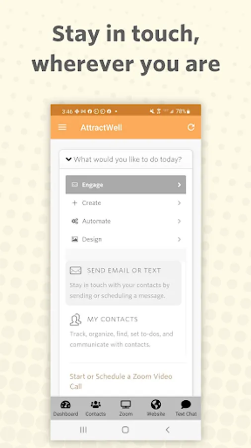 If you have your own AttractWell account, you can do all the work that you normally do in your back office, like managing contacts and to-dos, emailing people, and interacting in your member area.