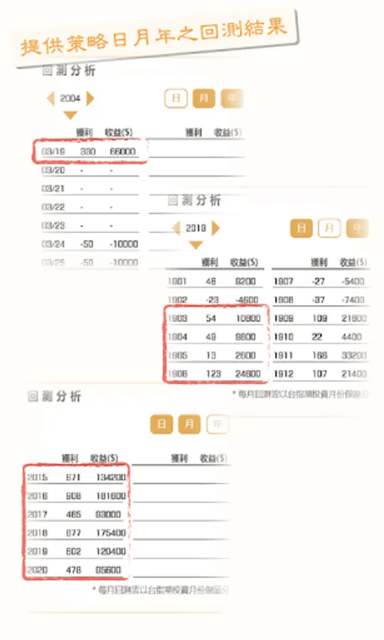 Revolutionary strategic investment sharing platform. Based on the data of the Taiwan Index Futures for the past 20 years as the basis of big data, AI intelligence is used for analysis and calculation to develop more accurate investment decisions. It also simulates various types of investment strategies and shares with you to grasp investment trends in advance, and then do a good job. Risk control allows you to create a life of wealth and freedom.