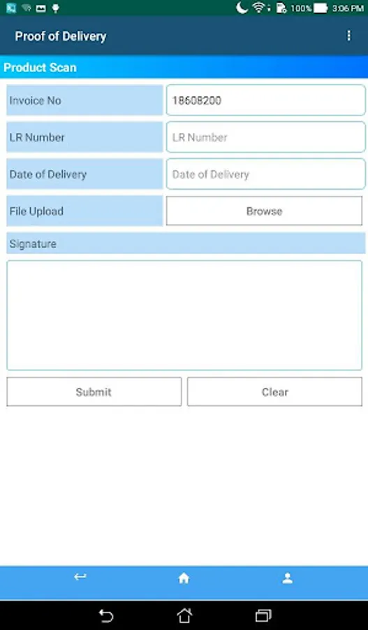 The application has been designed to capture and upload proof of material receipt at customer end. The application will be used by transporter to get the digital receipt confirmation at the time of delivering the material to customer. As a proof of document, the sign copy of the LR (Lorry Transport Receipt) from customer will be uploaded as Proof of Document.