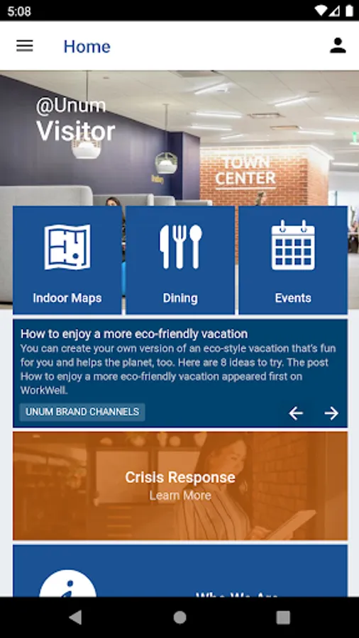 @Unum provides a seamless user experience, coupling work priorities with employee and guest resources. This mobile-friendly platform allows employees and visitors to explore campus maps and read important news from the palm of their hand. Further capabilities include push notifications, meeting room maps, and online food ordering.