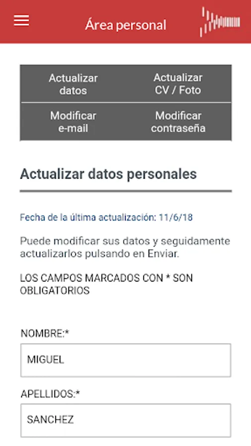 With this app you can also update your personal data and resume, as well as send us your questions or comments.