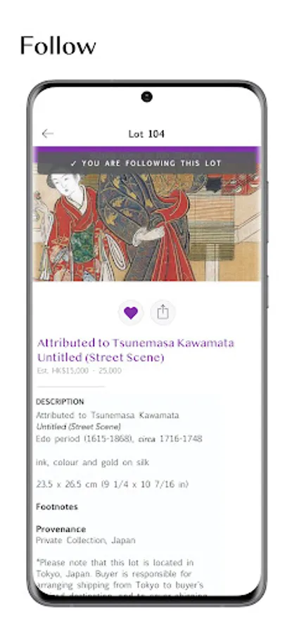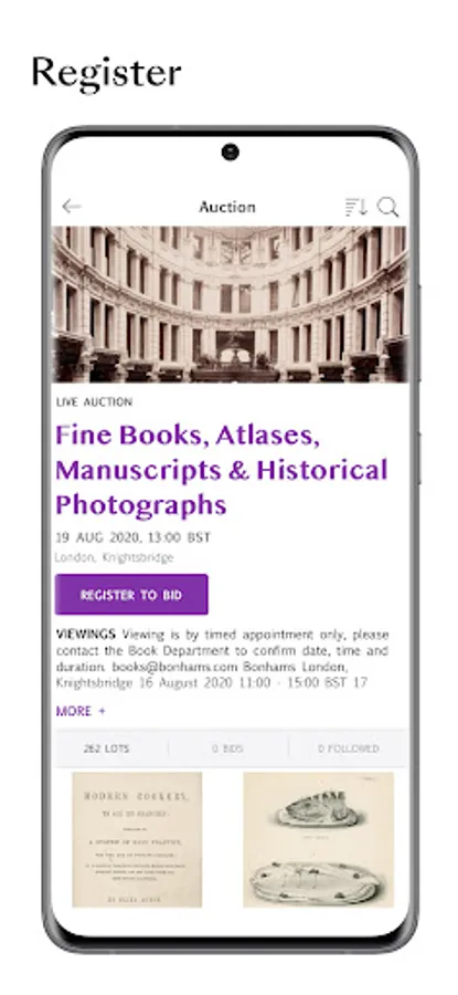 You can discover upcoming sales, follow your favourite lots and register with ease – no need for paperwork. You can watch our auctions and bid live or place absentee and online bids from anywhere in the world using your Android device.
