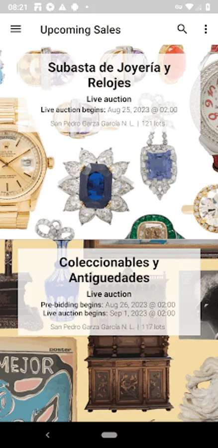 1. Subastas en vivoEs una subasta tradicional en un lugar y fecha especifico. Los participantes pueden unirse desde cualquier lugar con acceso a internet, seguir la transmisión en vivo y pujar a través de la App como si estuvieran en la misma sala de subastas. Los artículos en venta se exhiben con sus descripciones, imágenes y detalles relevantes mediante una presentación y un martillero designado que estará llevando a cabo el evento.
