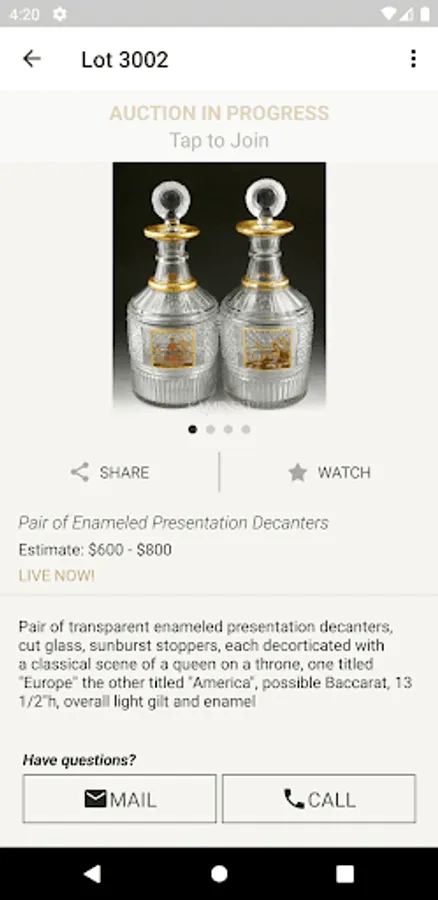 Kaminski Auctions, located in Beverly, MA, has been servicing the antique industry for over 36 years. We specialize in the sale of fine art, jewelry, furniture, and decorative arts. With offices in Beverly, Massachusetts and West Palm Beach, FL, and representatives in California, we represent estates from across the United States. Alongside this app, our gallery runs two other live bidding platforms to insure items reach buyers across the nation and around the world. We also offer personalized services for individuals, institutions, and collectors. Our clients have included Oprah Winfrey, Martha Stewart, The Waldorf-Astoria, and Mrs. Henry Ford II, to name but a few. With the Kaminski Auctions app, you can preview, watch, and bid in our auctions from your mobile / tablet device. Participate in our sales while on-the-go and gain access to our following features:
