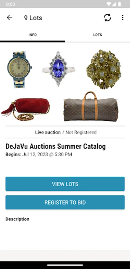 With the DeJaVu Auctions app, you can preview, watch and bid in our auctions from your mobile / tablet device. Participate in our sales while on-the-go and gain access to our following features: