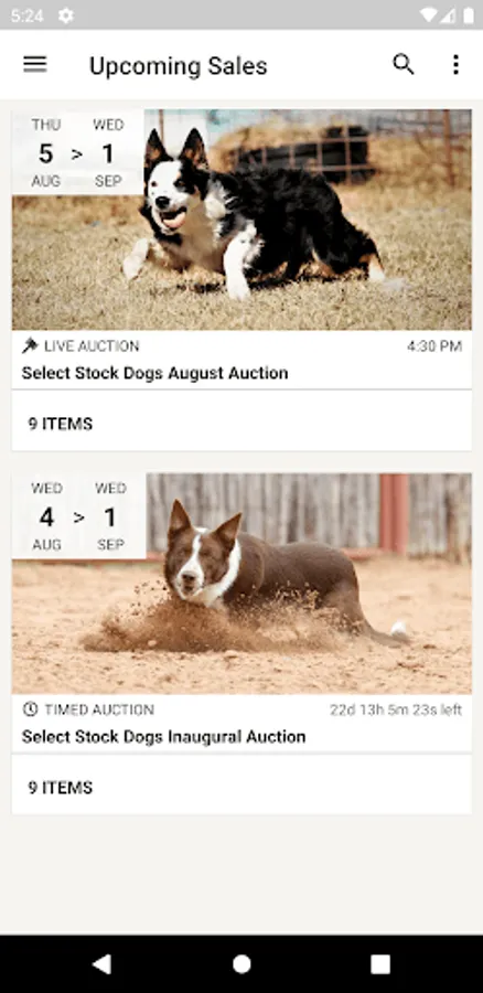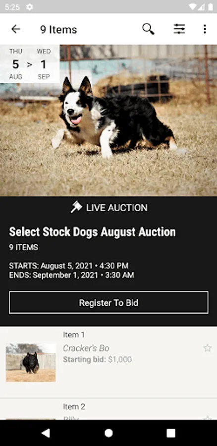 Select Stock Dog Sales is an exclusive auction company for stock dogs of all breeds - Border Collies, Kelpie, Hangin' Trees, Catahoulas, Heelers you name it! With both online and in person auctions happening throughout the year this is your channel to buy or sell great working dogs. Sellers are provided a brand new channel to sell their dogs to a larger audience and buyers have a "go-to" place when in search of a stock dog. Select Stock Dog Sales proudly presents a professional and easy to use auction platform available for everyone. With the Select Stock Dog Sales app, you can preview, watch and bid in our auctions from your mobile / tablet device. Participate in our sales while on-the-go and gain access to our following features: - Quick Registration - Following upcoming lots of interest - Push notifications to ensure you engage on items of interest - Track bidding history and activity - Watch live auctions