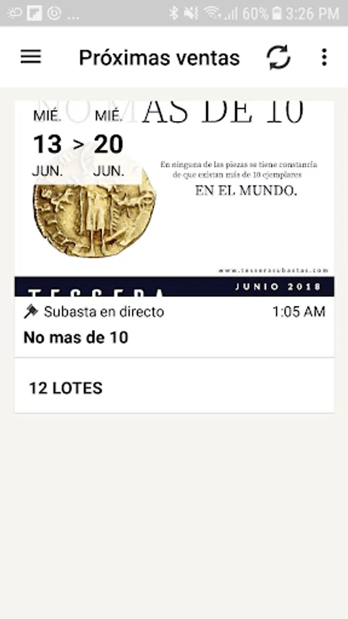 Con Tessera Subastas Auctions app puedes visualizar, pujas y comprar en todas nuestras subastas de una forma cómoda con el móvil o tablet (objetos como: arte, monedas y billetes, sellos, medallas, antigüedades, plata, joyas, objetos militares y de colección, artículos de famosos, vintage, etc.)