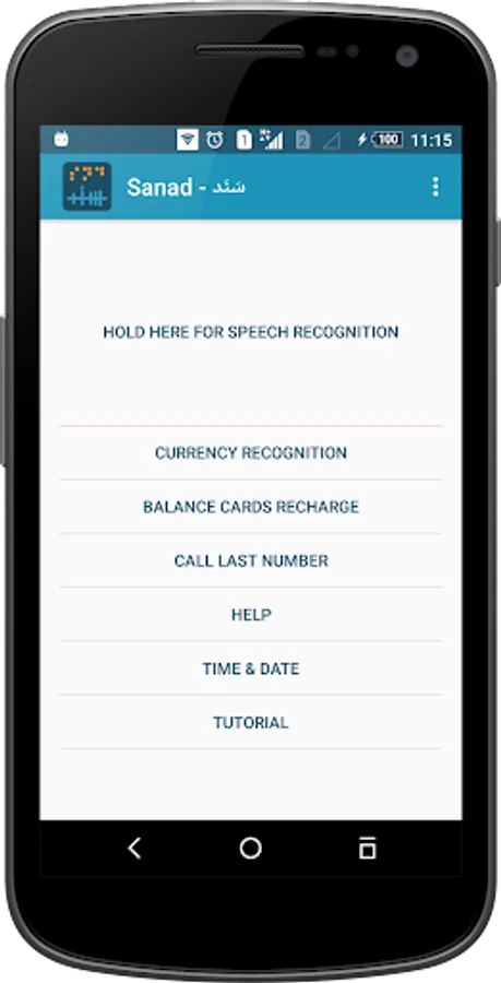 عند استخدام سند، تظهر شاشة تنقسم إلى قسمين؛ القسم الأعلي عن طريق استخدام الاوامر الصوتية و يكون في حالة الاتصال بالإنترنت، أما القسم الأسفل فهو لاستخدام الخصائص بدون الاتصال بالانترنت.