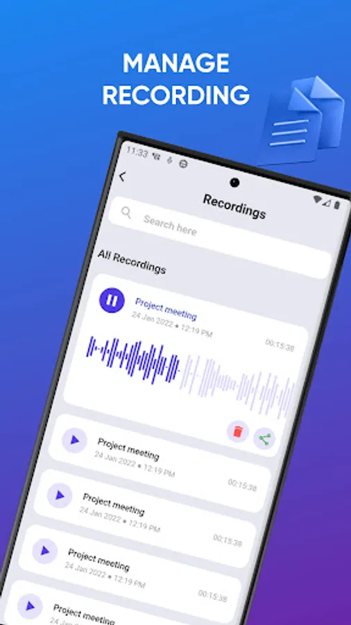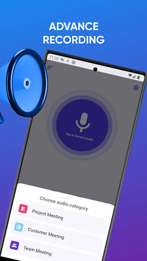 Easily categorize and manage your recordings with RecVoice's intuitive interface. Save your recordings in different categories like project meetings, customer meetings, and team meetings for quick and easy access. And with the ability to share audio files directly from the app, sharing your recordings has never been easier.
