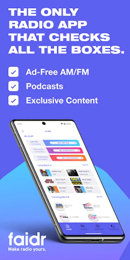 Welcome to faidr—the only audio app that combines commercial free AM/FM, podcasts, and exclusive music mixes and hosted shows.