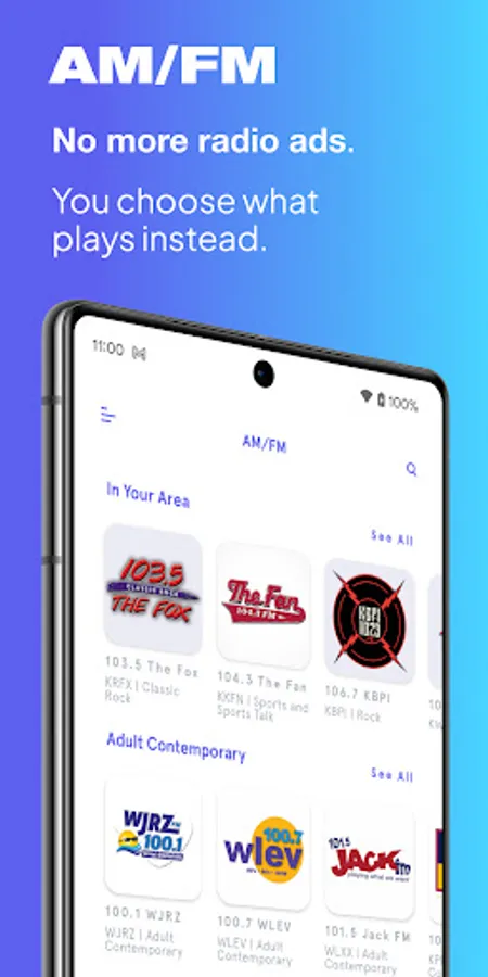 For subscribers listening to AM/FM stations, our technology automatically switches to a user’s preferred audio content during commercials, then returns you back to your station when the ad-break ends without missing a beat. We have over 5,000 live radio stations representing every major U.S. market, providing easy access to music, news, talk, sports and more. If we’re missing your station, we make it easy for you to notify us—and we’ll add it ASAP.