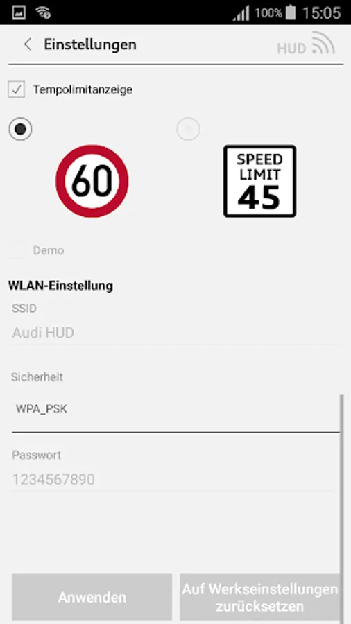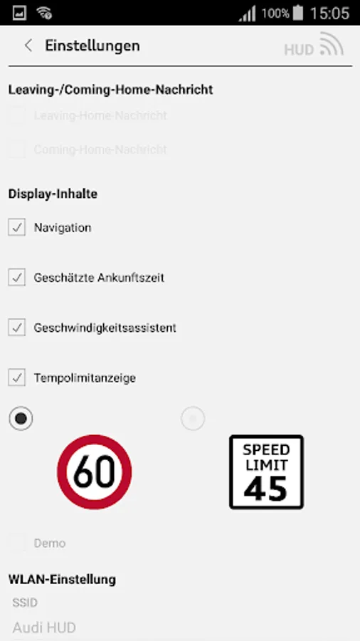 Its capabilities includes adjustment of display angle, brightness and Coming-home/Leaving home message. The seamless connection between the Head-up Display and the smartphone occurs via a internal Wi-Fi hotspot. All functions of the Audi HUD app require a Wi-Fi connection between the HUD and a smartphone.