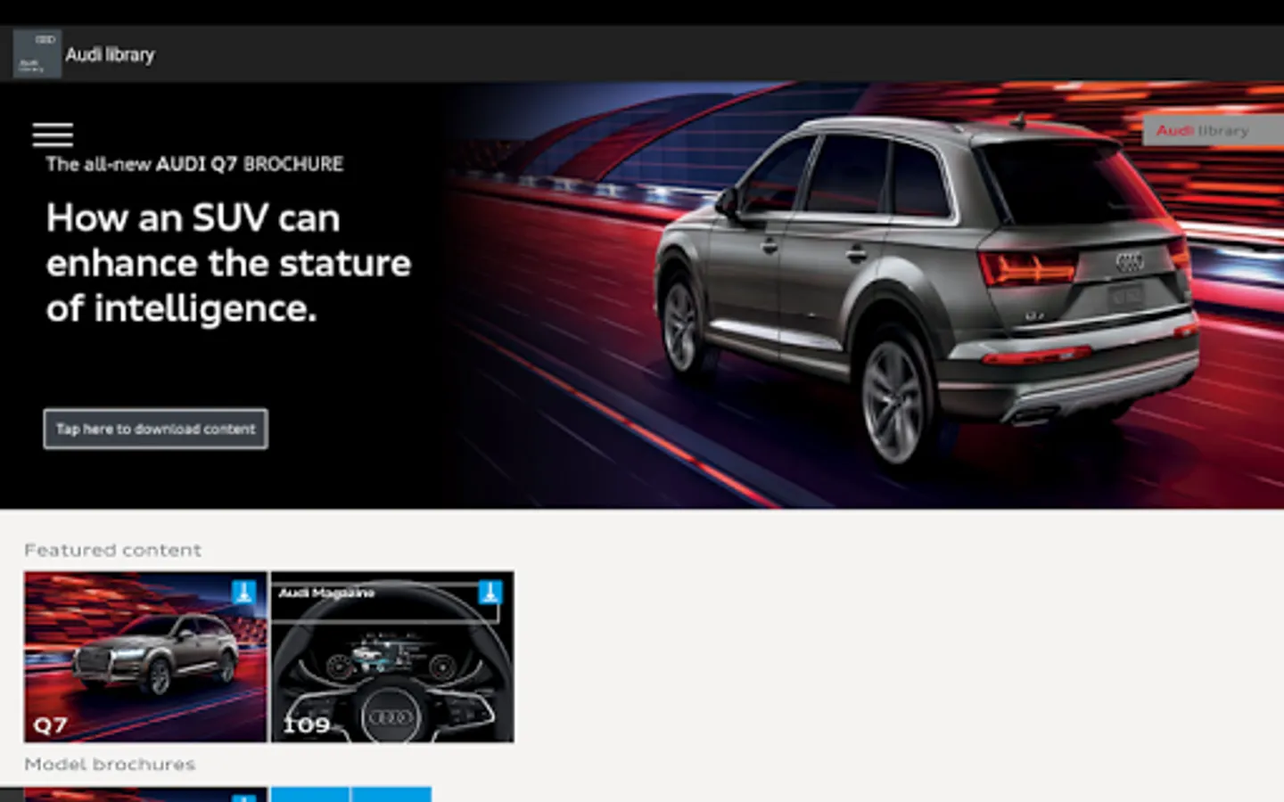 Welcome to the “Audi Library”. Consider it your official go-to source for everything the legendary automotive brand stands for. The highly innovative format gives you a variety of information about Audi, from our award-winning models to game-changing technology and more. The “Audi Library” is your front-row seat to the exciting world of Audi.