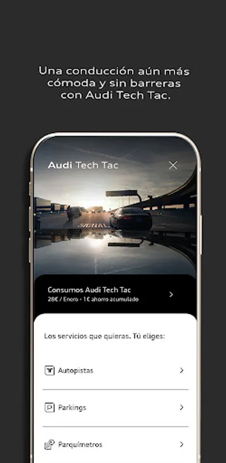 In addition, from myAudi&Me you can request the Audi Tech Tac: a telepayment device with which you can pass without barriers or tickets at tolls, car parks, parking meters, gas stations and car washes, in addition to obtaining exclusive discounts for its use. A device that will make your driving even easier, so that nothing stops you.