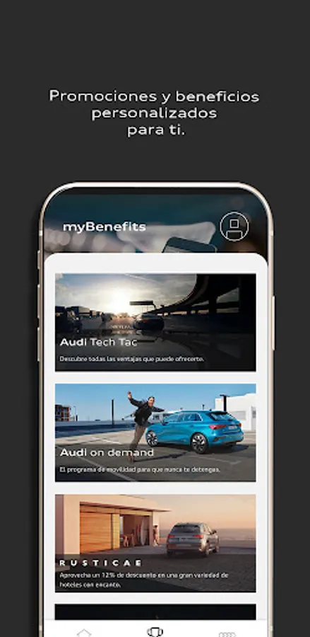myBenefits: take advantage of all the mobility services offered by Audi, unique discounts at Hilton and Rusticae hotels, a free 6-month subscription to Filmin and an exclusive travel guide by Traveler for Audi customers.