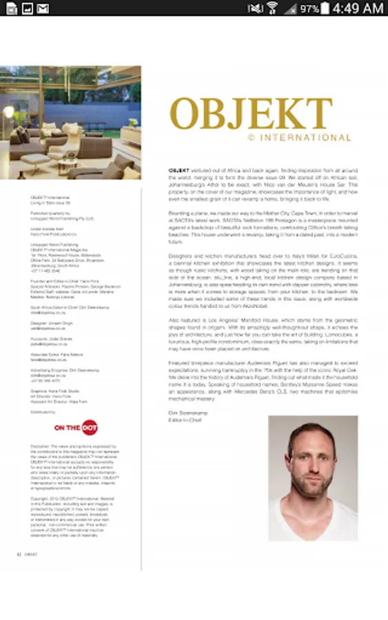 Objekt is the world's leading home, décor, design, architecture as well as luxury cars and watches magazine. Featuring only the best from Cape Town to Las Angeles and Paris to Beijing as well as everything in-between. With industry changing photographers and in-depth reviews Objekt truly is in a class of its own.