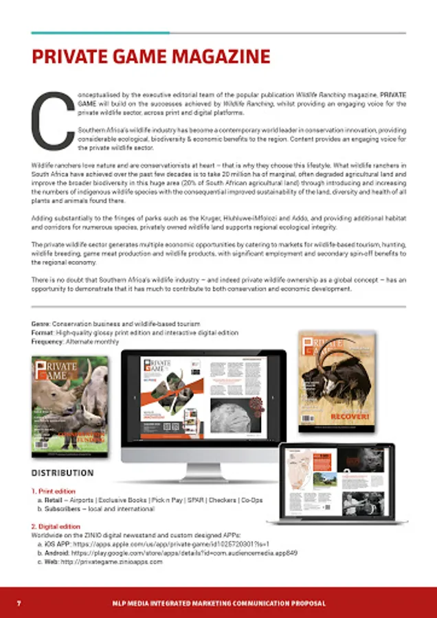 Conceptualised by the executive editorial team of the popular publication Wildlife Ranching magazine, PRIVATE GAME will build on the successes achieved by Wildlife Ranching, whilst providing an engaging voice for the private wildlife sector.