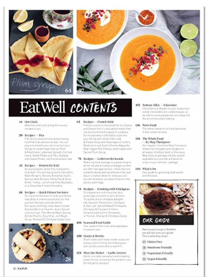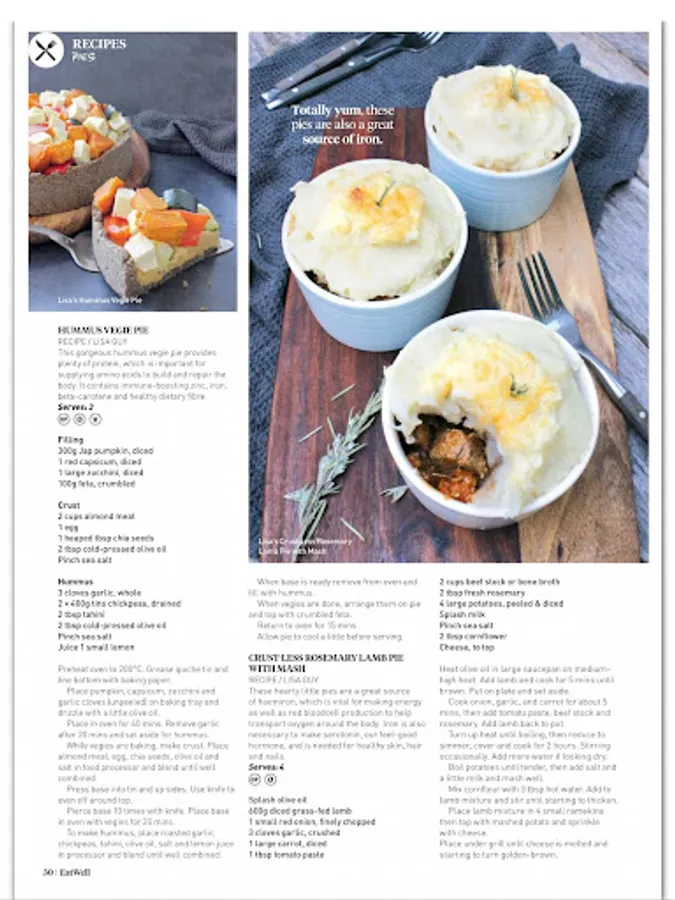 A sexy Recipe Mag that has a healthy approach to good food. Taste every page as you flick through – delicious! Why bother? Because everything in here is good for you, easy, and yum. We know you are busy so we give you everything you need to eat well – recipes, shopping lists, quick ideas. You’re tapping in to a heap of wisdom from passionate chefs, bloggers and caring home cooks. You can share yours too – we’re a community. Life’s short…. outsource your food plan to people who love healthy good food. If you stopped buying recipe mags years ago because they’re full of things you can’t eat – then try Eat Well! Over 70 recipes per edition.