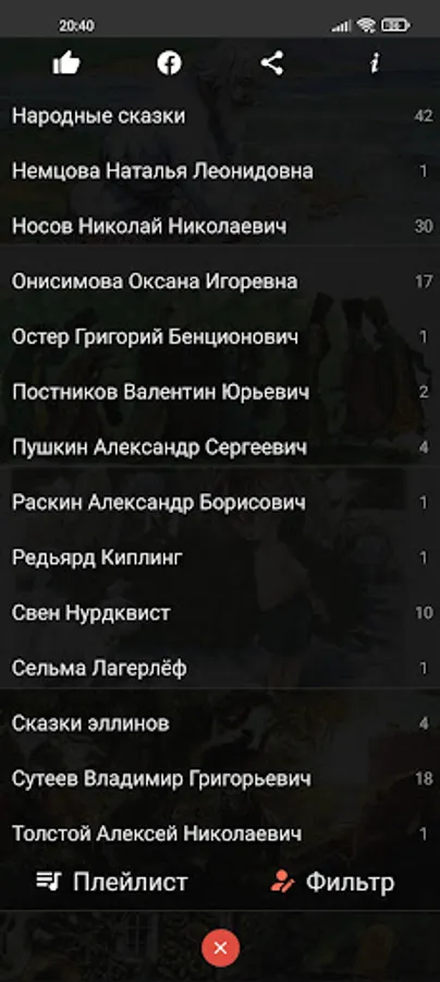 Search for the desired fairy tales by title or by author, or by speaker, or by age