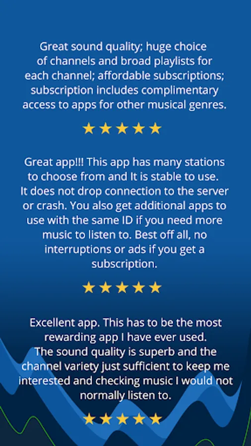 Our channels list includes a wide variety of music types to fit your exact mood, from Top Hits to Smooth Jazz, Classic Rock, Mostly Classical, New Age, Country, EuroDance or even Jpop. Come explore a world of music choice!