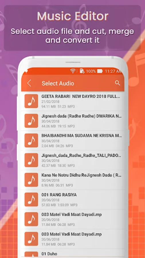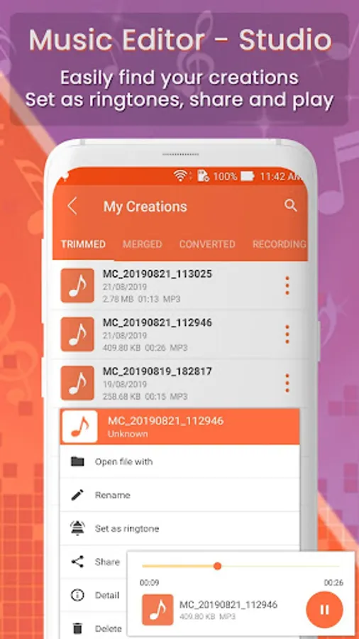 Music Editor is powerful and complete features like Trim audio(cut audio), merge multiple audio files with one file and change song positions, convert audio with multiple formats and quality and record audio with multiple format and quality.