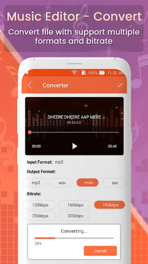 Convert Audio file with multiple formats supports MP3, WAV, AAC, M4A and most other music formats and select bit-rate to make fantastic ringtones.