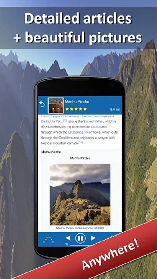 With over 350 000 articles (rated 0-5 stars), it's just like having a universal travel guide always in your pocket. You will discover places, monuments and museums everywhere, even next to your home! Just select any of them to open the article on Wikipedia with pictures and detailed explanations.