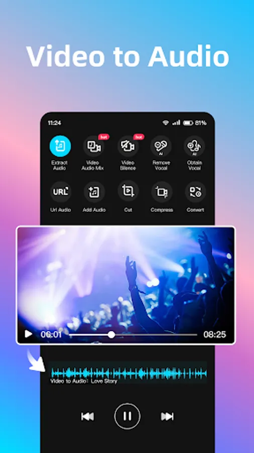 Video sound editor & Video audio editor: You can use the video to audio function to extract audio from video and convert video to MP3.