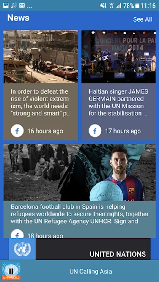 Be up to date on what is happening in the United Nations and around the world, straight from the source. Listen to the latest news bulletins and features stories, daily radio programs, interviews, daily press briefings and live coverage of many UN General Assembly and Security Council meetings. Available in Arabic, Chinese, English, French, Portuguese, Russian, Spanish, and Kiswahili.