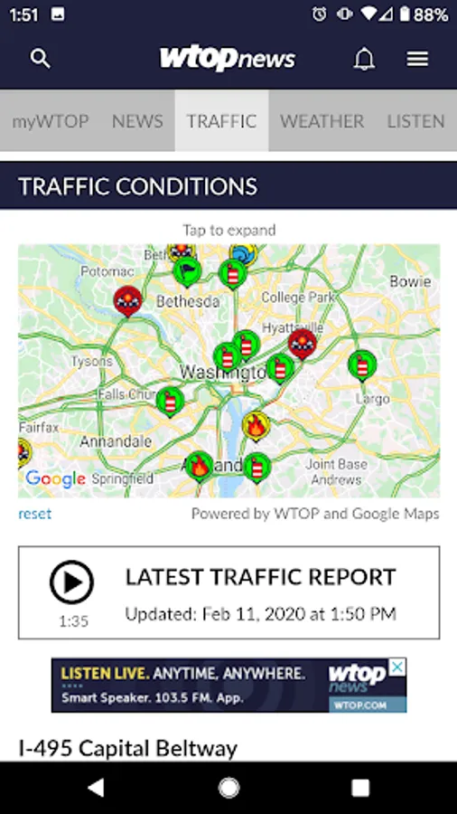 *Miss a traffic report on the radio? Our latest reports can be heard on-demand in the app. *Where is traffic the worst? View our map powered by the WTOP Traffic Center and Google Maps.