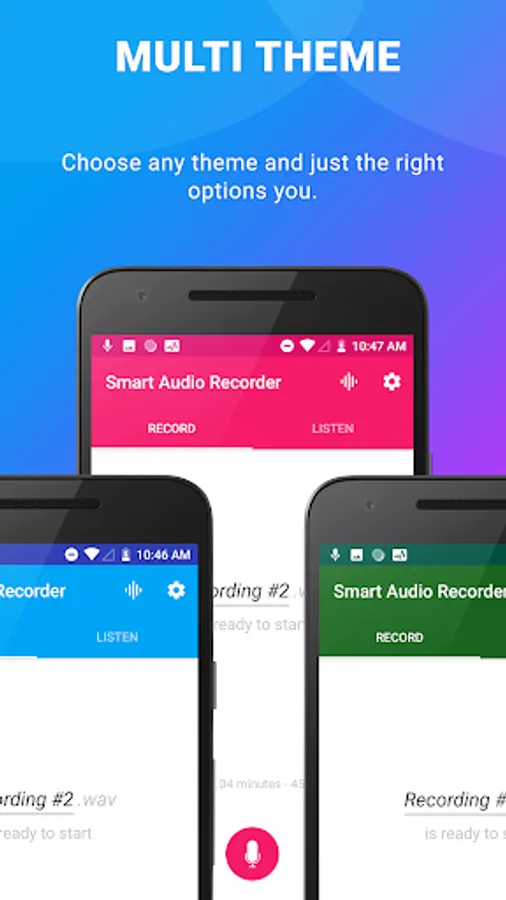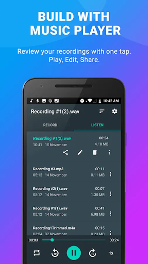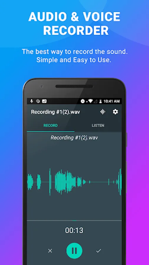 With a wide variety of options for refining recordings, this audio recorder for android is useful for rehearsal and audio-visual sessions. Quickly try new ideas, hear the results and make new changes. You can quickly switch between voice recorders, meetings, lectures, music and sound rough with settings and extremely easy to use presets.