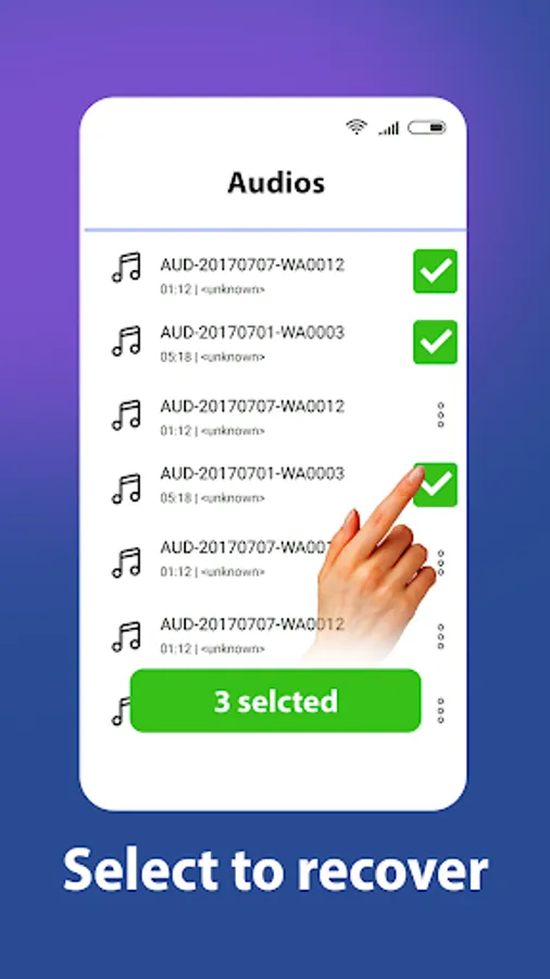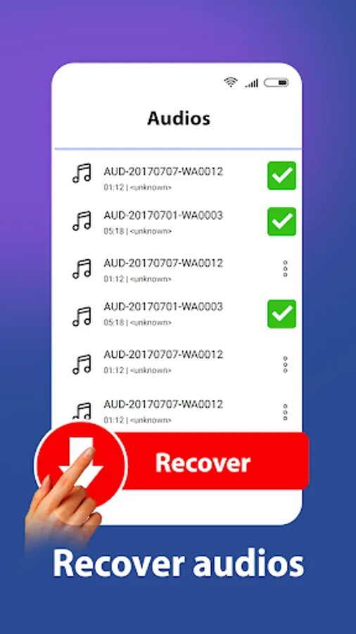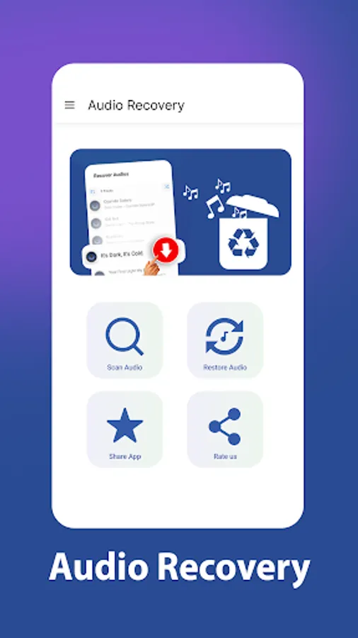 Deleted audio files from the SD card or phone memory (internal storage) (External storage)? Sometimes, unintentional actions cause us to lose crucial audio files. Delete call recording recovery app such files may contain significant or memorable moments that are significant to us. You can easily recover deleted audio files from internal and external storage with the help of the program audio recovery - Retrieve Deleted Audio Recordings. With the audio recovery option, it will assist you in recovering those files. The audio recovery option will aid in your ability to recover those files which are deleted from your phone. An audio recovery app can recover deleted audio files if someone is having trouble finding the best audio recovery program. With the help of the call recording recovery app for Android, you can recover your enormous amount of audio data. You don't have to root your phone. With the best call recording recovery app for Android, recover a large amount of data. You can skip unnecessary and unwanted files from recovery if you don't want to. It can help you recover deleted audio from your phone storage or external storage. You can preview the deleted audio before restoring them. Are you frustrated by accidentally deleting audio files? Do you want to recover deleted audios quickly? Simply install this app called "Deleted Audio Recovery" and create a backup of all your audio files. Once you install this Audio Recovery Software - restore audio files from phone internal storage app, any audio file that gets deleted from your phone can be retrieved using the "Restore Deleted Audios" feature within this audio recovery app. With the "Deleted Audio Recovery" app, you can perform a deep scan of all the audios on your Android device, create a backup of them, and restore them in case of accidental deletion. This audio recovery app is an incredibly useful tool to ensure the safety of your audios from accidental deletion. The "Restore Audio Files from Phone Internal Storage" feature of this app can recover audios of various formats. What sets this "Restore Deleted Audios from Phone" app apart is its ability to selectively recover and restore only the audios that you want, while leaving out any useless or unwanted audios.