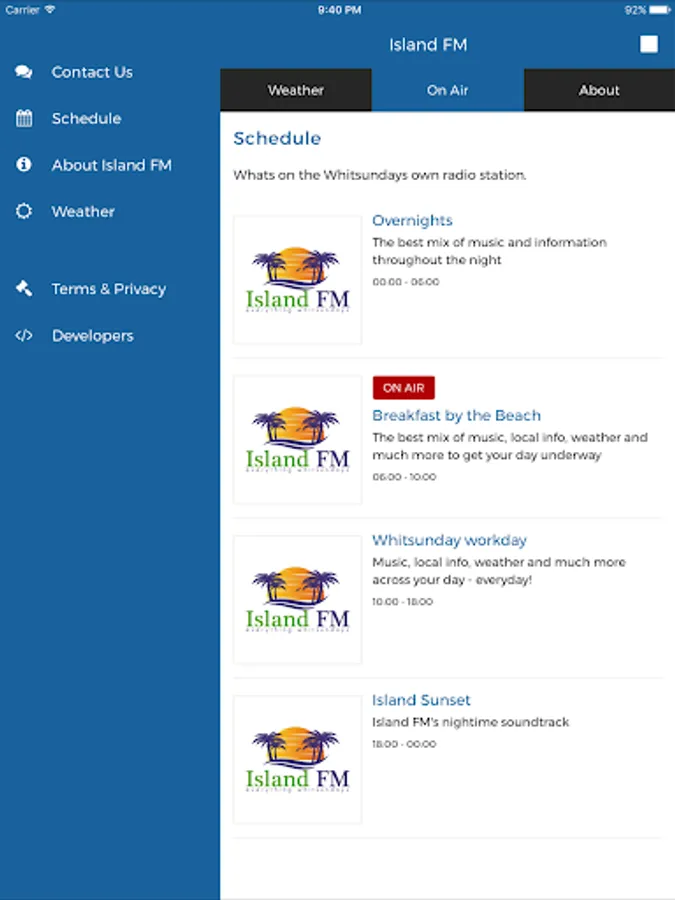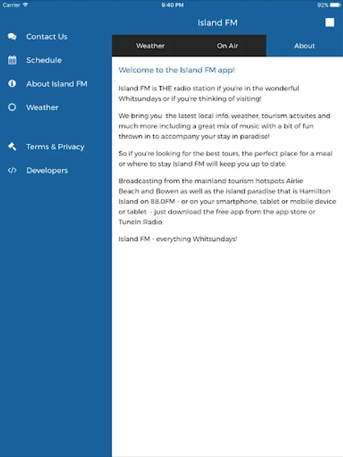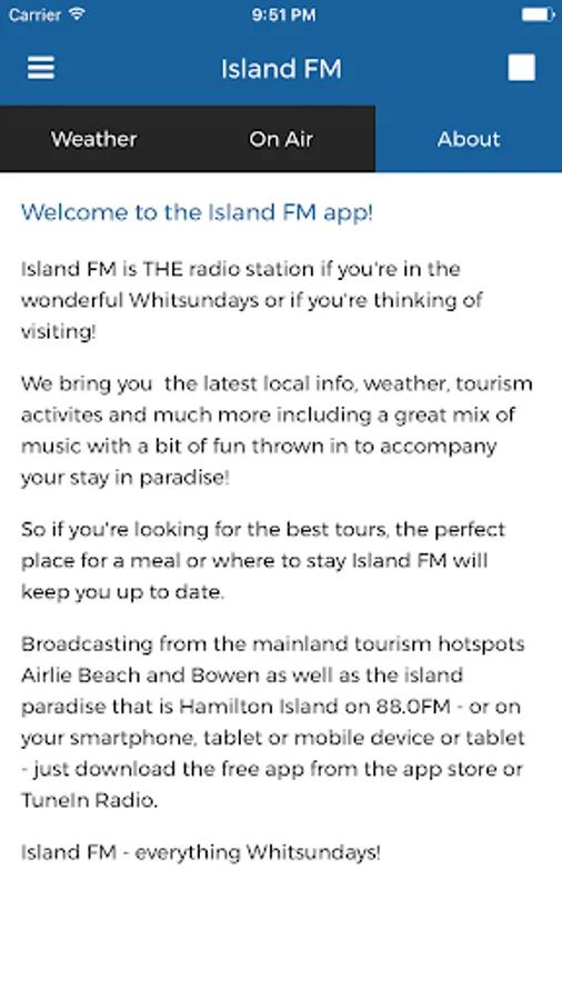 Island FM - everything Whitsundays! Broadcasting to Airlie Beach, Hamilton Island, Bowen and the Whitsundays on 88.0 FM or listen to us from anywhere on your smartphone, tablet or the web. Get the latest info, news and weather from the wonderful Whitsundays.