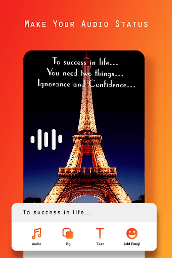 So, Have you ever wished that you could easily post that part of a song or audio that you think is amazing? Well, Audio Status Maker lets you do just that. With Audio Status Maker you can pick or record audio from your library, trim the audio to pick the part that you want to share and then convert it to an audio status by either choosing from a selection of several backgrounds available in the app or use your own custom image as the background. You can then show off your creativity by adding text, emotes, or drawings on top of your status to give it a nice touch.