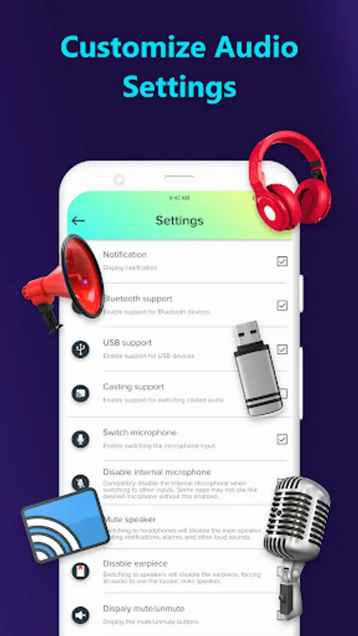 When the headphones are inserted or removed from the jack, the app will automatically detect them. When switching to the desired output, choose the microphones from the handset, USB, internal, and Bluetooth options to utilize.