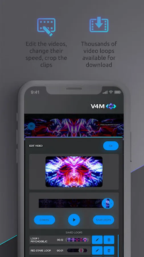 The two video channels have slider controls that allow the VJ to control the speed, opacity and sensitivity of each video loop, as well as assigning a blend mode and a layer style which customises their visuals. You can also edit and save cropped versions of any of the video loops so that you build up your own library of loops to mix with. The app launches with over 30 exclusive video loops included for free, and features a Video Shop that will give users the ability to browse and purchase new material from an extensive library of Video Loop Packages. This way, you can build a custom video library to suit your own style and needs.