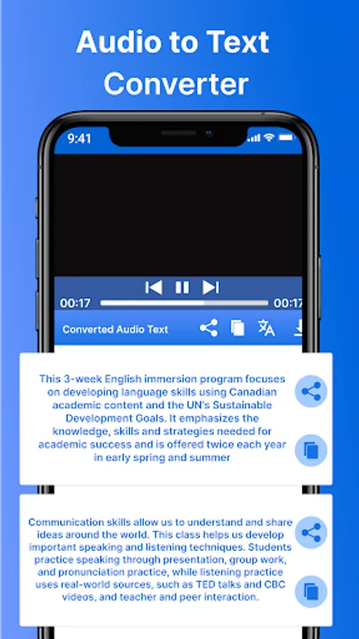 The Audio to text translator app supports 24 languages; Chinese, Catalan, Czech, Dutch, English, Esperanto, French, German, Hindi, Italian, Indian English, Japanese, Kazakh, Korean, Portuguese, Polish, Persian, Russian, Spanish, Swedish, Turkish, Ukrainian, Uzbek, and Vietnamese. The audio to Text converter also translate the same extracted text from audio into 60+ other languages offline.