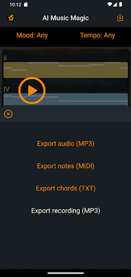 Export as an audio file, loopable harmony file, multitrack MIDI file, or chord notation