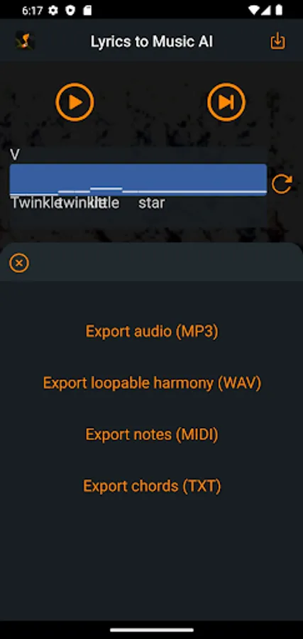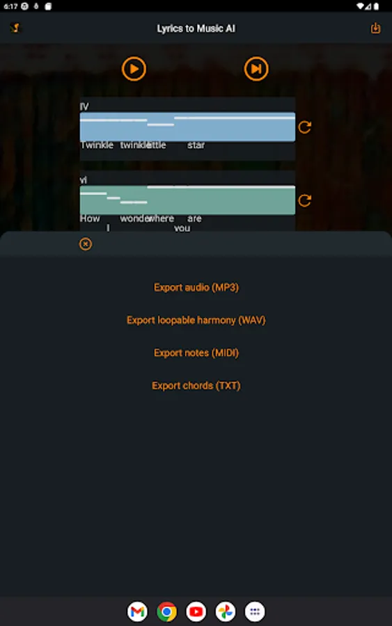 Export as an audio file, loopable harmony file, multitrack MIDI file, or chord notation