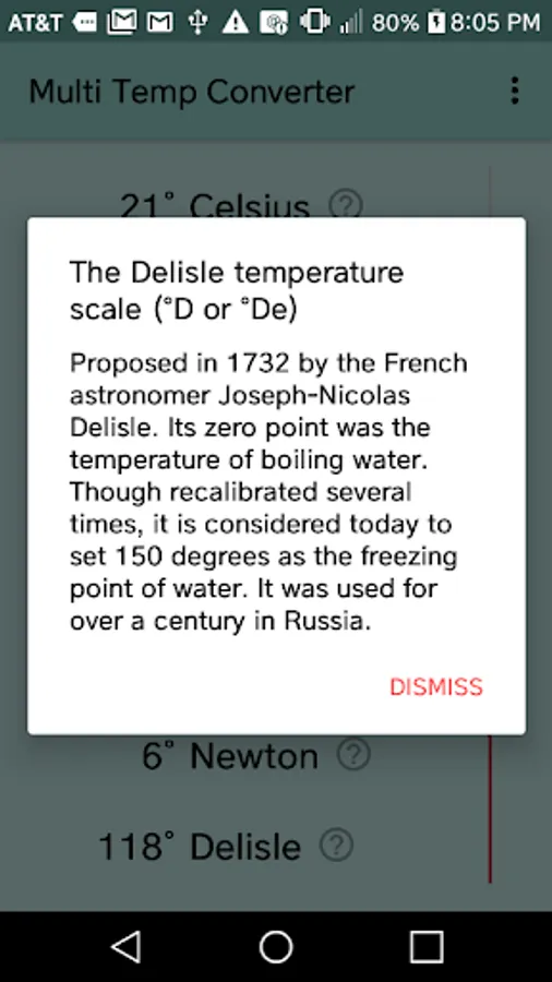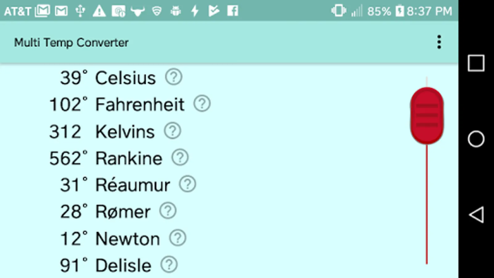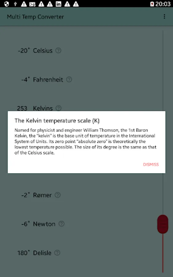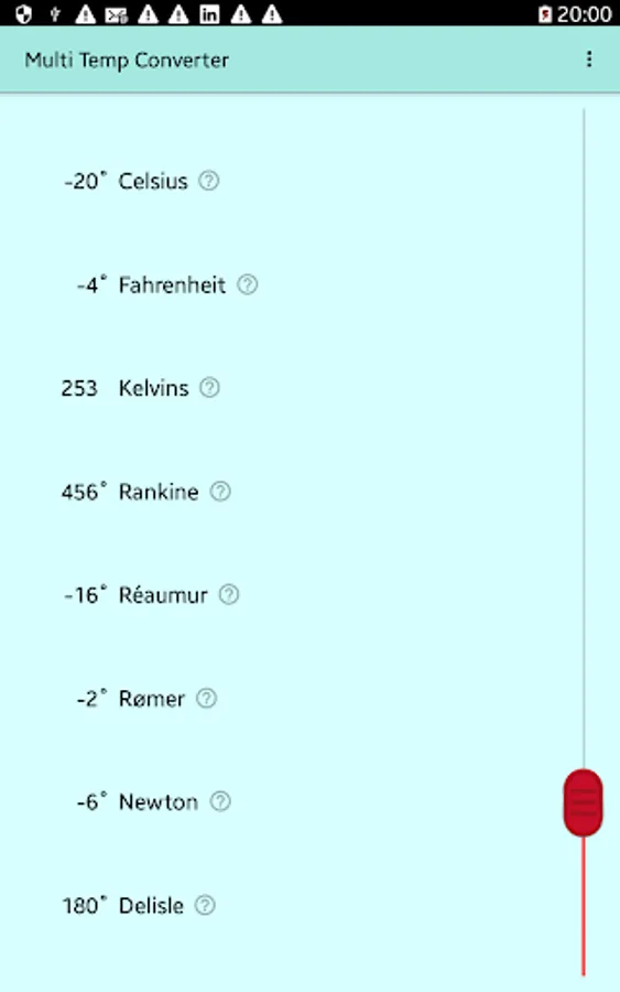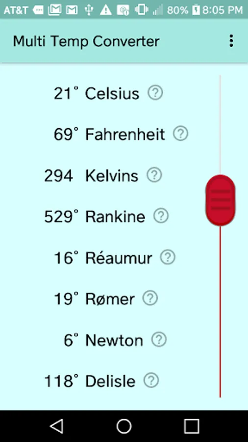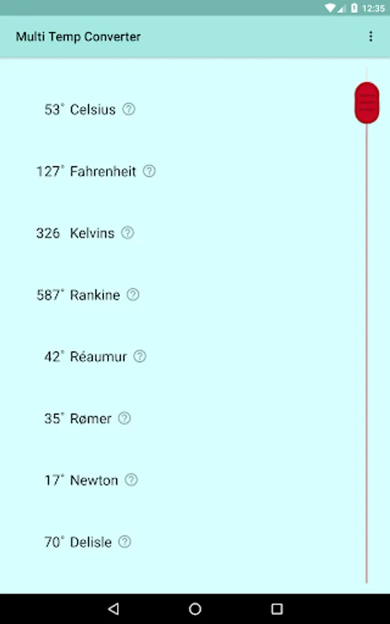 Use this app to easily convert between eight different temperature scales, some currently used and some of historical interest: Celsius, Fahrenheit, Kelvin, Newton, Réaumur, Rankine, Rømer, and Delisle. Just drag the red handle and conversions are done simultaneously for all scales. Includes short descriptions of each temperature scale. Handy for students, scientists, engineers.