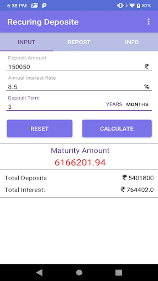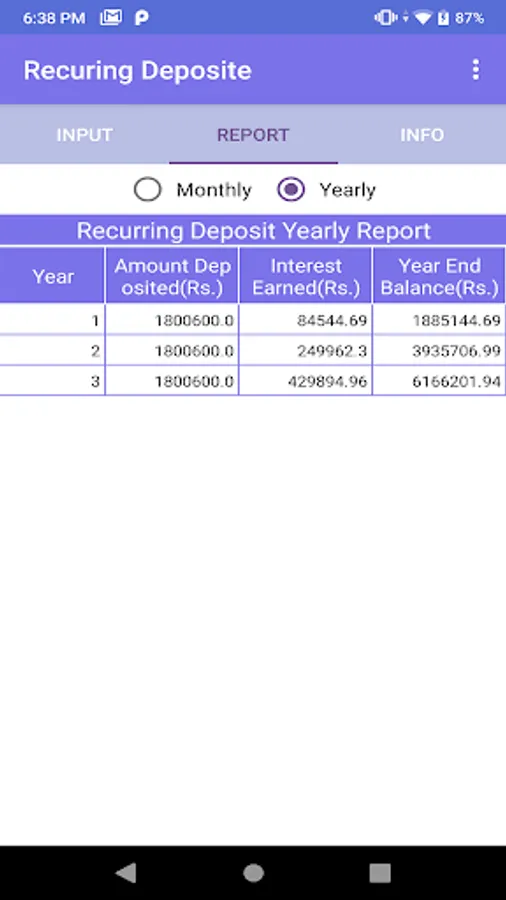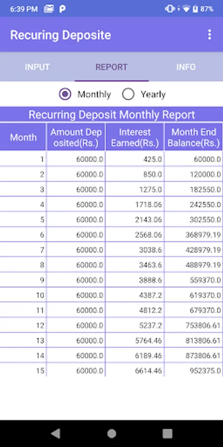 * Displays "Total Amount Deposited" and "Total Interest Earned"