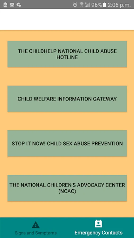 Our application, Coaware, has two simple tabs designed for child abuse: Signs and Symptoms, along with Emergency Contacts.