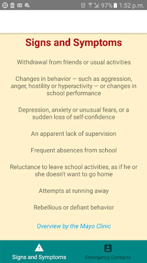 Signs and Symptoms is a simple tab that uses a layout to detail the various red flags that may be evident during situations of child abuse. The idea here is that individuals, such as neighbors, will be able to have an emergency ‘pocketbook’ that they can refer to if they are ever suspicious. Although it may seem trivial, having a resource as accessible as a mobile application can help individuals raise awareness to prevent further abuse and neglect. All of the signs of symptoms on the mobile app are from the Mayo Clinic. (https://www.mayoclinic.org/diseases-conditions/child-abuse/symptoms-causes/syc-20370864).
