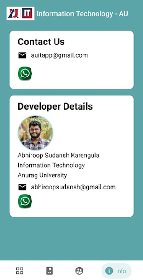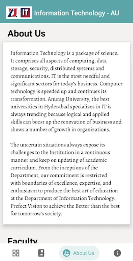 This app gives you whole the info about the INFORMATION TECHNOLOGY department of ANURAG UNIVERSITY, HYDERABAD. This consists of TimeTables, Academic Calendars, Events in the dept., Placements, Faculty of the dept., etc.