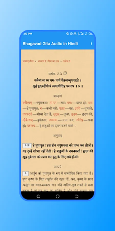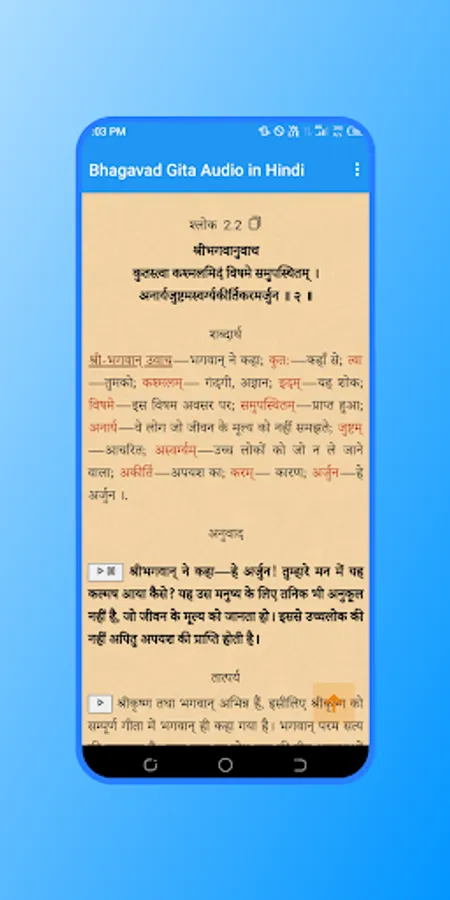 Overall, the Bhagavad Gita Audio in Hindi app is an excellent resource for anyone interested in studying the Gita. With its comprehensive translations, professional audio recordings, and easy-to-use interface, this app provides a valuable tool for anyone seeking to understand the teachings of the Bhagavad Gita in Hindi.