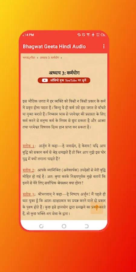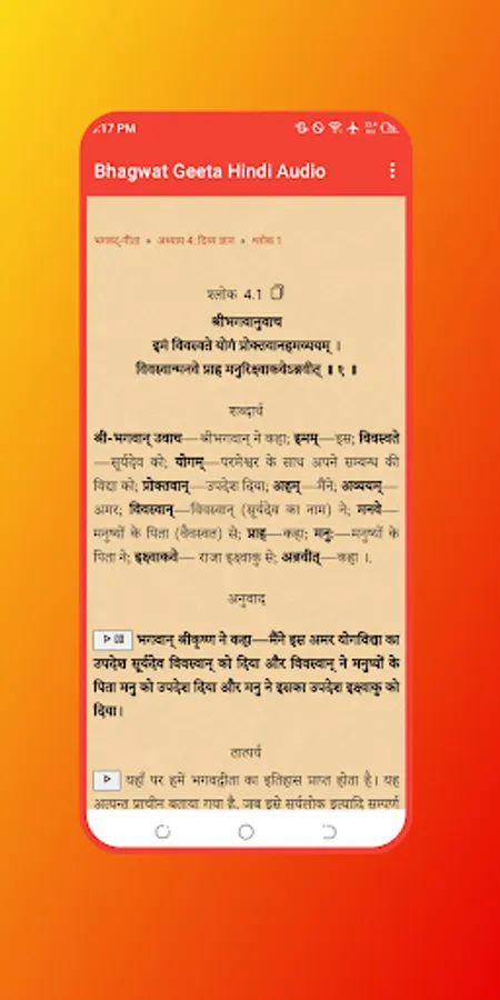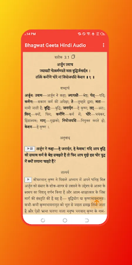 The Bhagwat Geeta Audio in Hindi upholds the philosophical traditions of the Upanishads, integrating dualism and theism. It imparts wisdom on the path of devotion and the doctrine of selfless action, inspiring many leaders of the Indian independence movement, including Mahatma Gandhi, who referred to it as his "spiritual dictionary."