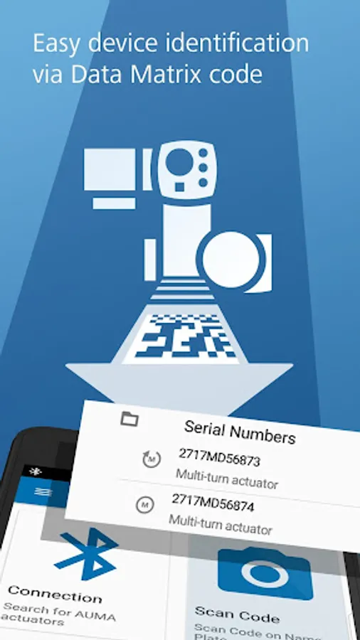 • Scanning the data matrix codes of your name plates to record simple device information such as the serial numbers of your AUMA devices