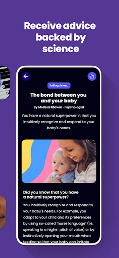 But our app offers more than just tracking and sleep aids. Our extensive collection of Baby Sleep Education content provides you with valuable information and advice to deepen your understanding of baby sleep. From sleep stages to sleep training techniques to proven bedtime rituals, our expert tips and articles will help you better understand your baby's sleep habits and create optimal conditions for healthy sleep.