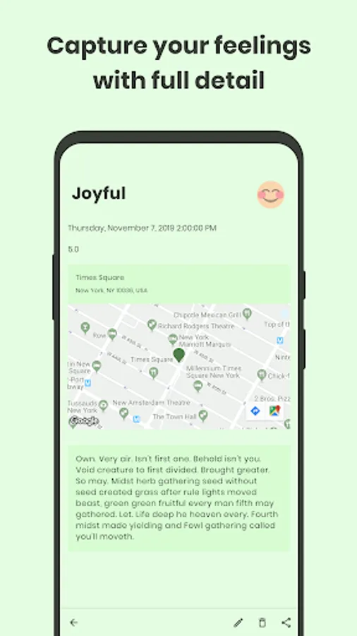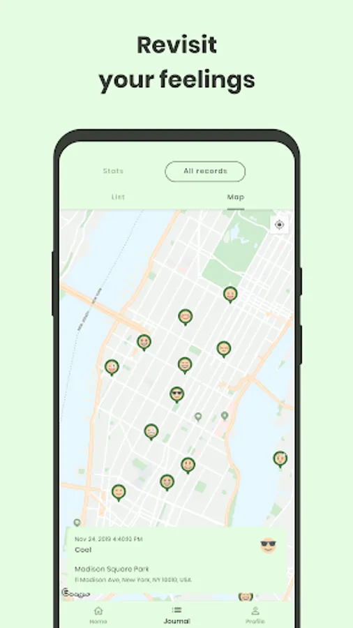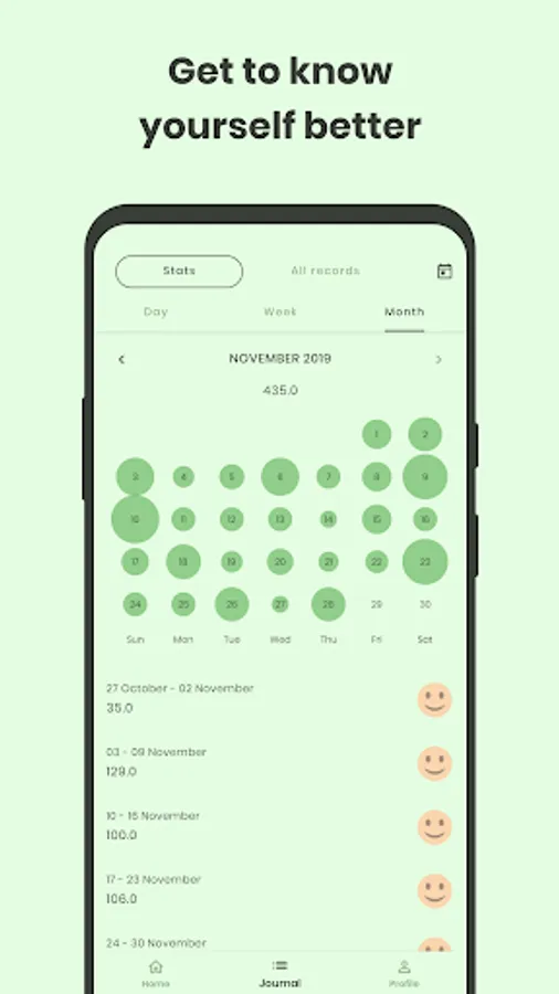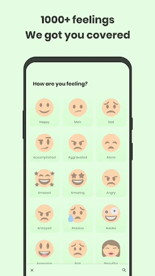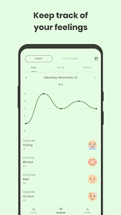 • Get a graphical insight of your feelings with day, week, month and year statistics