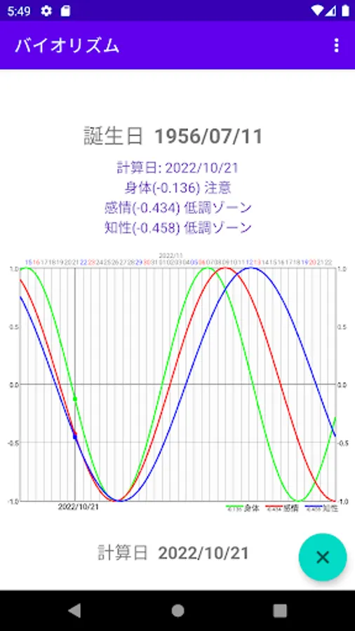 Displays physical, emotional, and intellectual waves graphically and numerically.